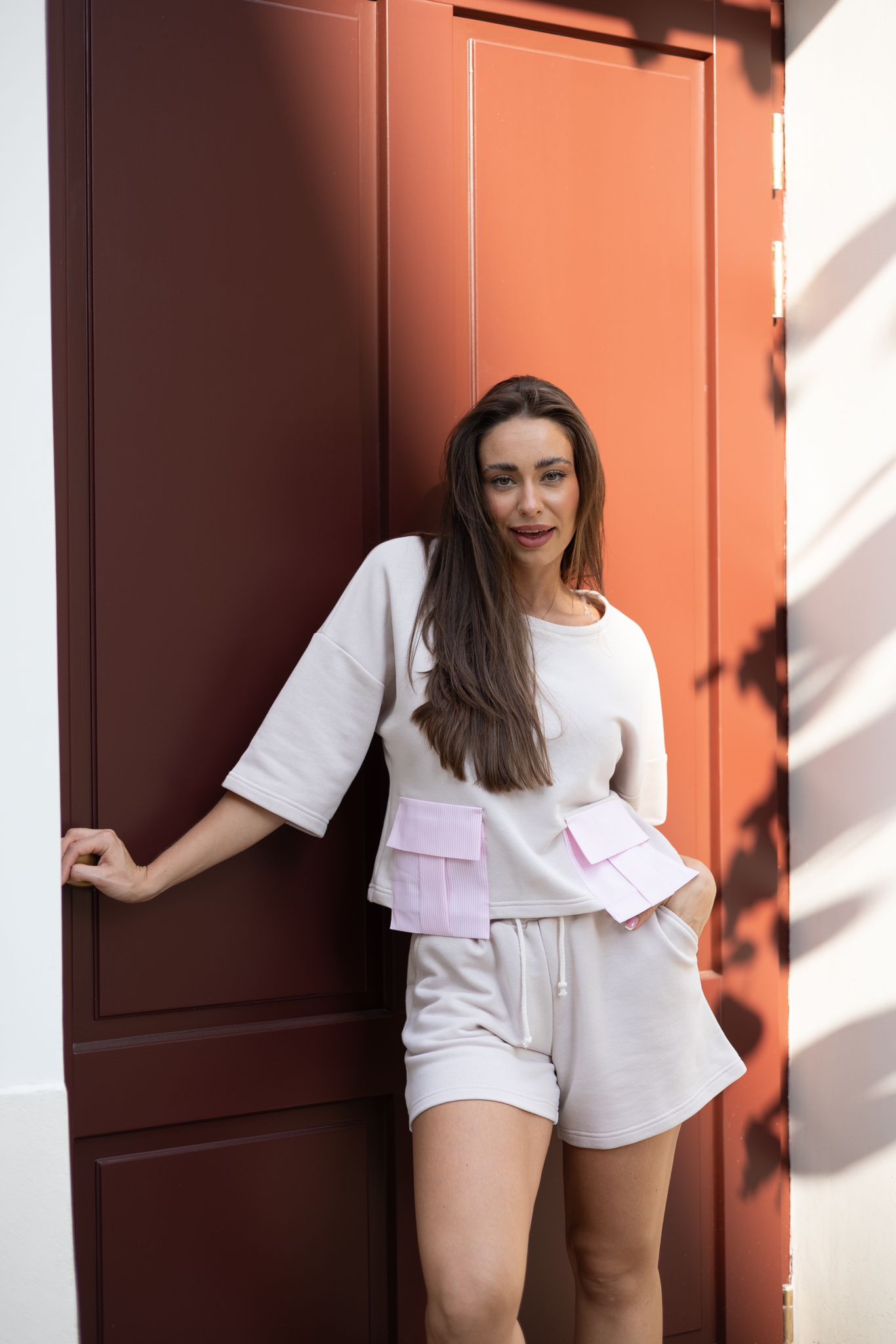 Dwuczęściowy komplet dresowy damski, idealny na codzienne wyjścia, home office albo totalny chill. Wyróżnia się unikalnym designem – naszywane kieszenie z kontrastowego materiału (jasnoróżowe, prążkowane) dodają całości oryginalnego charakteru.